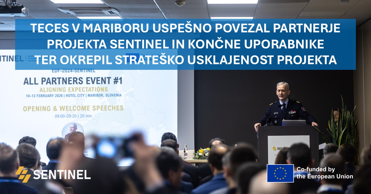Več kot 130 udeležencev iz 16 evropskih držav se je med 10. in 12. februarjem 2026 zbralo v Mariboru na prvem srečanju vseh partnerjev projekta SENTINEL. Tridnevni dogodek, ki ga je kot koordinator projekta organiziral TECES, je pomembno prispeval k poenotenju razumevanja ciljev projekta, uskladitvi pričakovanj partnerjev ter krepitvi sodelovanja s končnimi uporabniki. Posebej je bila izpostavljena prioriteta tesnega in stalnega sodelovanja z ministrstvi za obrambo, ki je ključno za zagotavljanje operativne relevantnosti in uspešne izvedbe projekta.