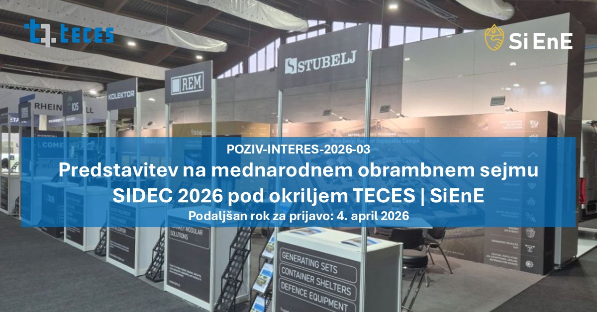 Cilj poziva je omogočiti skupno in prepoznavno predstavitev članov partnerstev TECES | SiEnE na drugem mednarodnem sejmu obrambne industrije SIDEC 2026 ter spodbuditi aktivno vključevanje slovenskih podjetij, raziskovalnih organizacij in drugih deležnikov, ki razvijajo tehnologije in rešitve na področju obrambe ter dvojne rabe (dual-use).